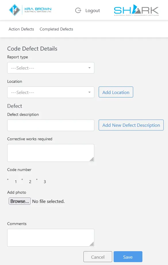 Selecting the New Code Defect button will give a blank page similar to the Action Defects and Complete Defects pages.